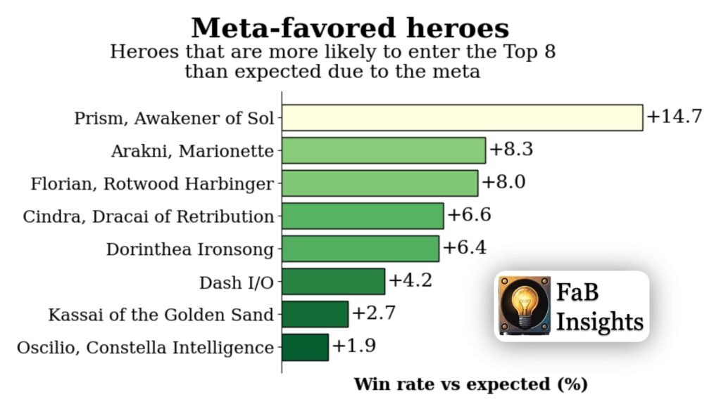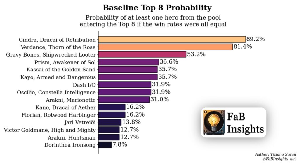 But does the high number associated with Cindra mean that she is 6+ times stronger than, for example, Dorinthea with a 14.2%? Not at all. We have to always keep in mind that the hero with the highest chance of appearing in Top 8 (and likely to win events) is also the hero with some of the highest representation in the field.